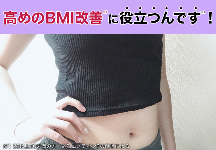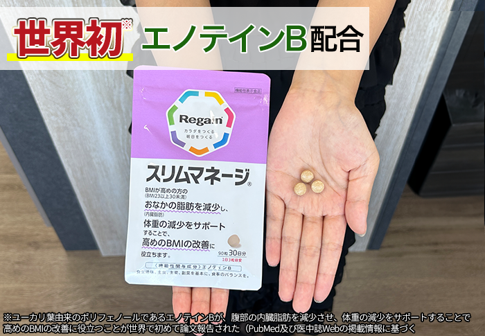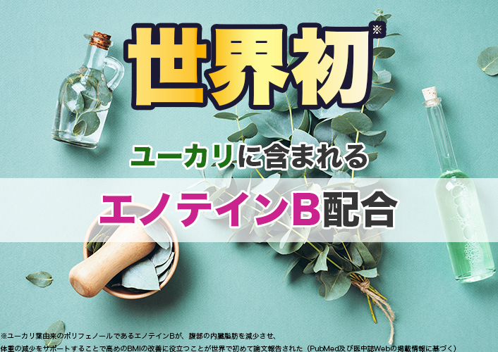 ※2 ユーカリ葉由来のポリフェノールであるエノテインBが、腹部の内臓脂肪を減少させ、体重の減少をサポートすることで高めのBMIの改善に役立つことが世界で初めて論文報告された(PubMed及び医中誌Webの掲載情報に基づく)