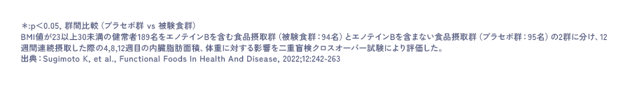 ※ユーカリ葉由来のポリフェノールであるエノテインBが、腹部の内臓脂肪を減少させ、体重の減少をサポートすることで